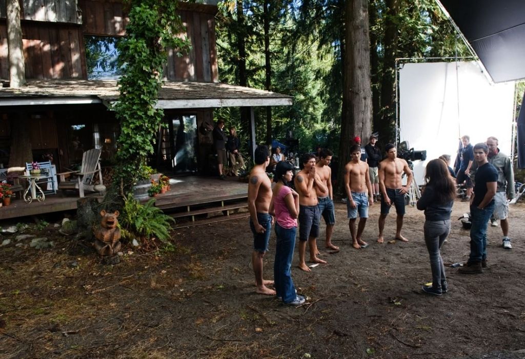 Saiu um still dos bastidores das gravações de Eclipse, dos lobinhos lindos e sarados com a Emily e a Bella, na casa da Emily, confiram: